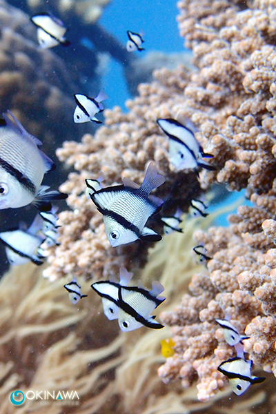 水面付近はロクセンスズメダイ、キホシスズメダイ、オキナワスズメダイ、イスズミの群れが!