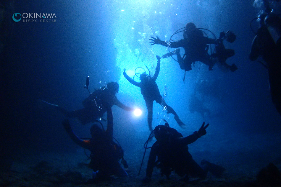 今日のラストは真栄田岬の青の洞窟へ〜!陸は絶賛曇り中だったので、水中集合写真を!