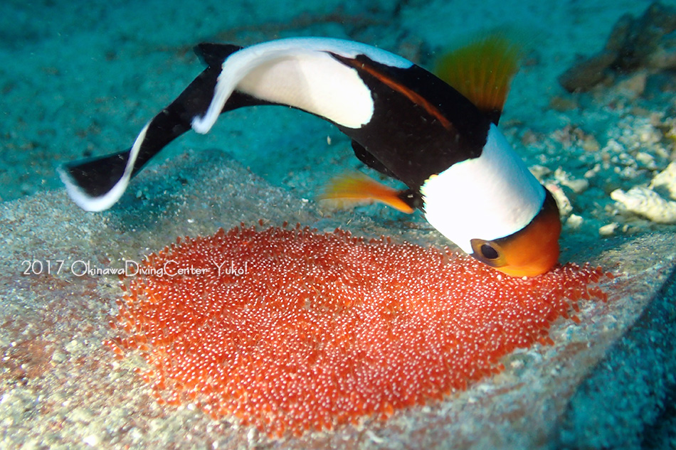 トウアカクマノミの卵が赤くて綺麗っ。 カクレクマノミはまさに産卵なう状態で産卵管を出して卵を産み付けてました。