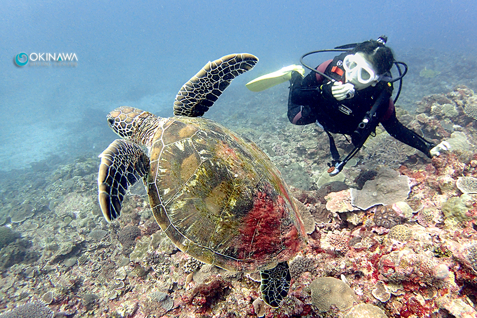可愛いサイズのアオウミガメ、むしゃむしゃと昼食中でした!