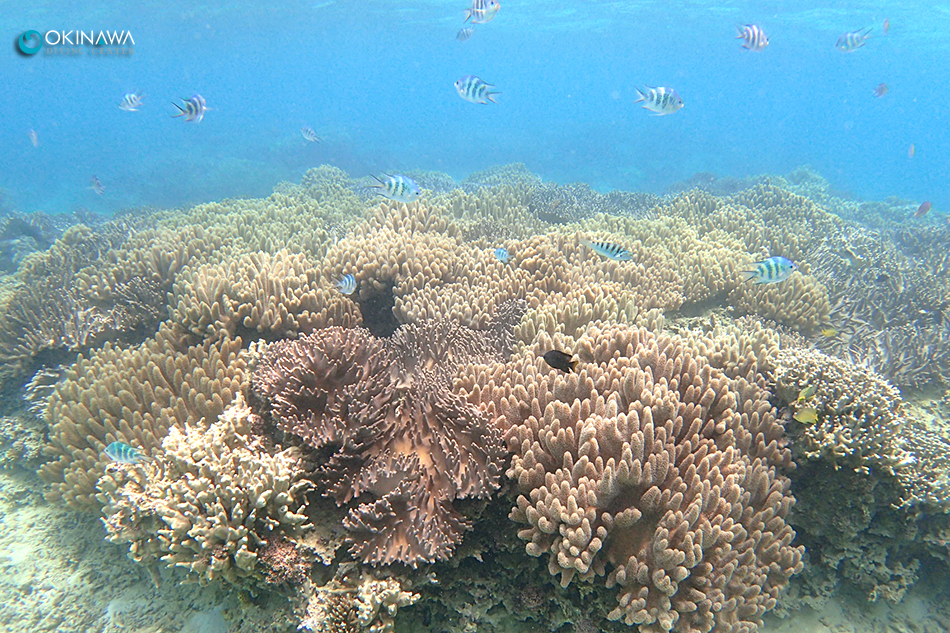 透明度よく、真っ白な砂地に太陽の光が射し込んでくるとプールの様に海の中がキラキラでーす。