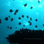浅場はサンゴも綺麗でスズメダイ系がキラキラと沖縄らしい光景です。