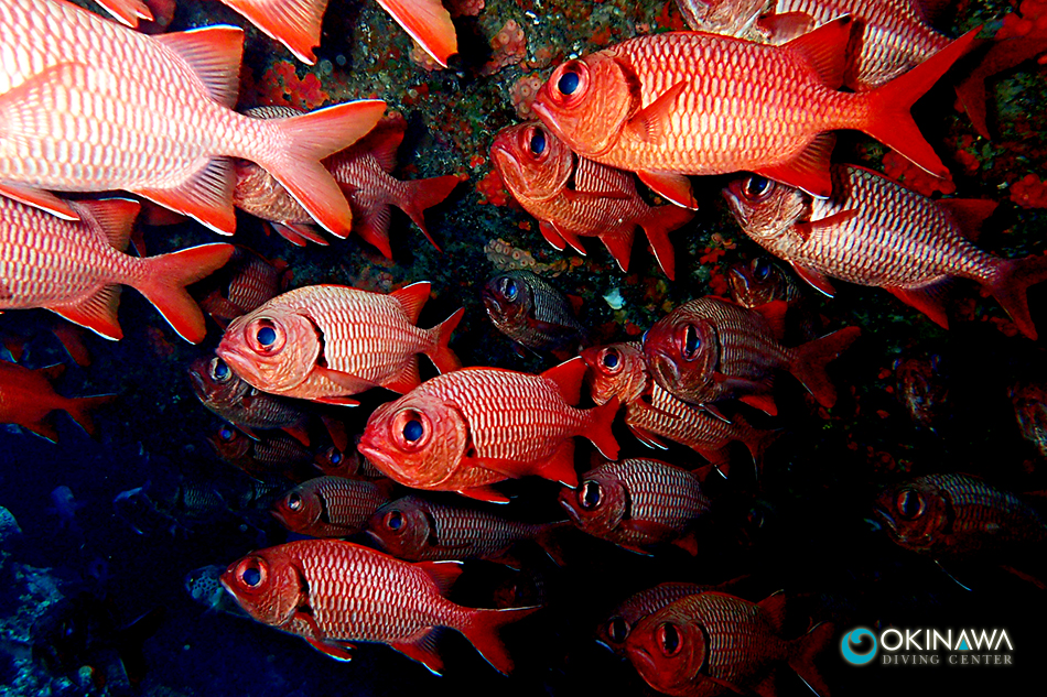 穴の中にはリュウキュウハタンポやアカマツカサの群れの群れ!キンメモドキやスカシテンジクダイの群れに