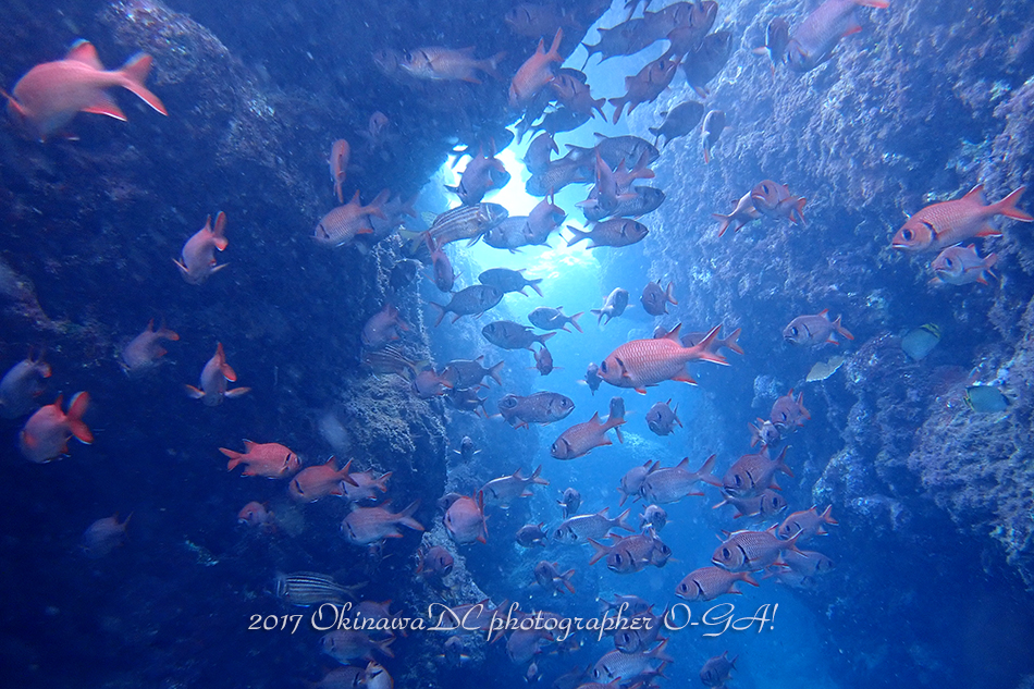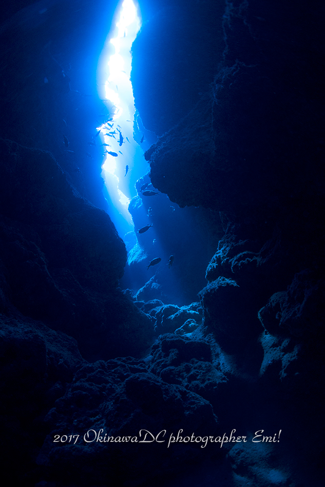 ミニドリームホールでは亀裂の射し込む光、その隙間に1mくらいのモヨウフグがいきなりでてきてビックリでしたが愛嬌あってカワイイぞーっ。