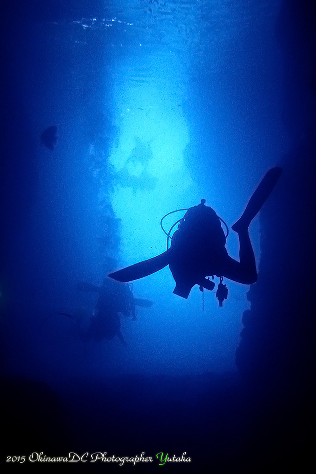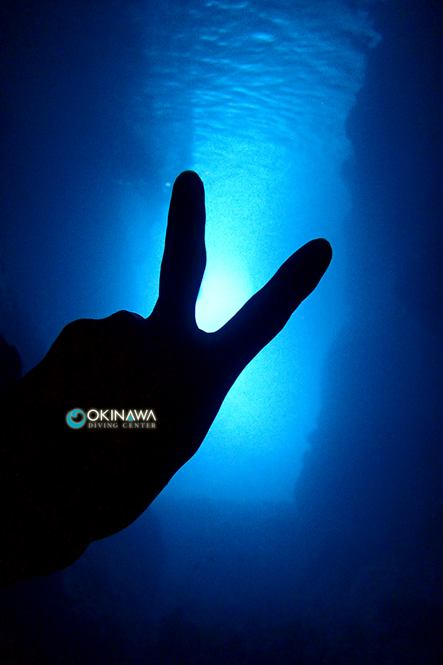 朝一は透明度最高の真栄田岬でしたーっ!ついつい洞窟の中でもピースが・・・。