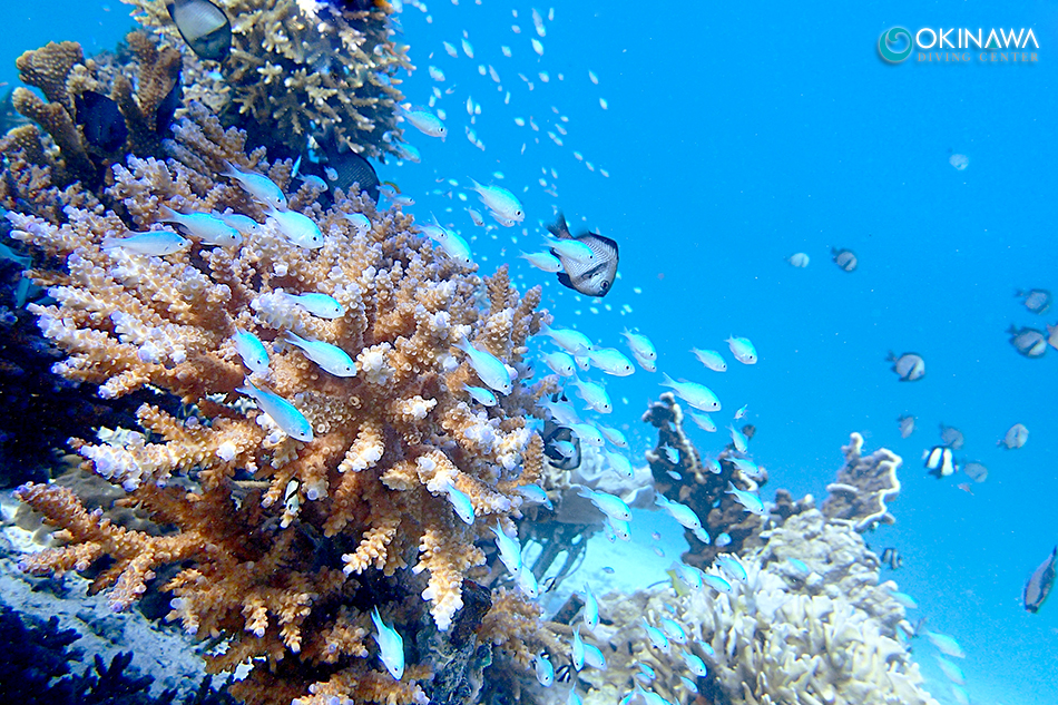 サンゴにはデバスズメダイ、フタスジ・、ミスジリュウキュウスズメダイがわんさか群れてます。