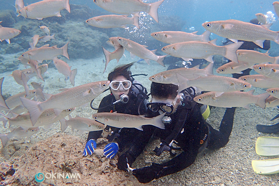 頭の上をリュウキュウボラが大群でグルグルまわってますが、はじめは緊張してて目に入らないみたいですが、慣れてくるとその多さにビックリしてます♪