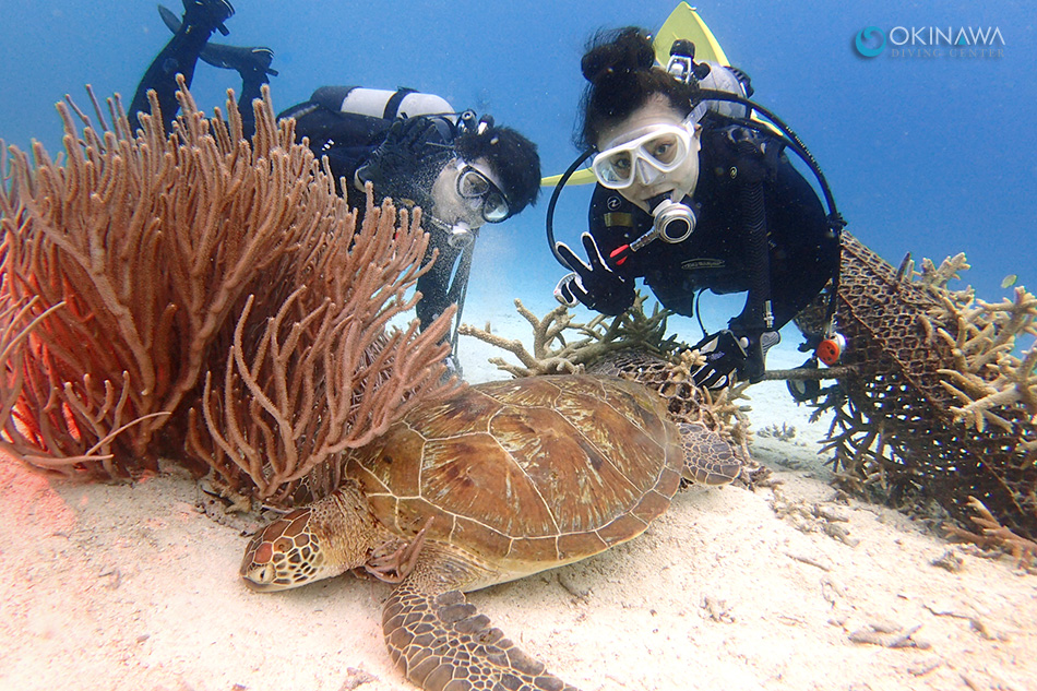 初めましてのT様、M様!ゆっくり泳いで行き着いたサンゴの養殖場でカメに会えました♪