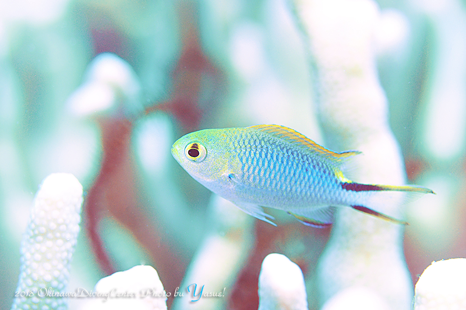 ユビエダハマサンゴの間をちょろちょろする綺麗な色のスズメダイです。