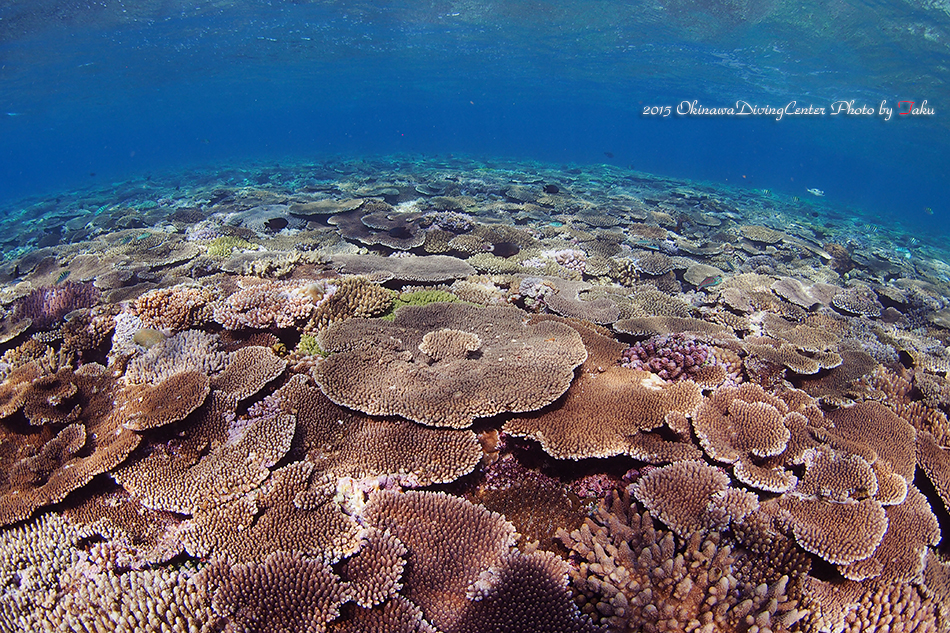潮が満ちてたので、ちょっと浅場まで足を延ばすと、まるでサンゴの絨毯です~!