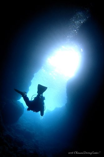 数匹のツバメウオも洞窟内をグルグル泳いでいてくれて、シルエットのいい被写体に♪