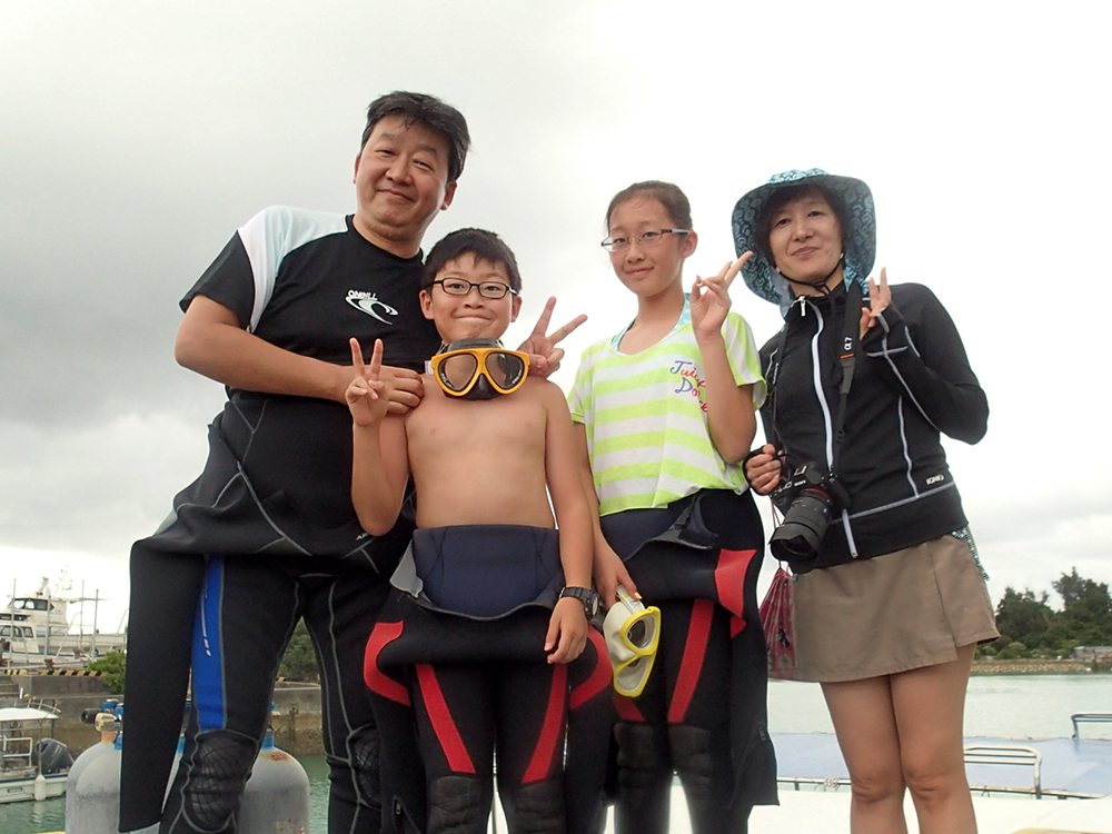 ダイビングは初めてなので緊張していましたが、13才の娘と11才の息子まで手取り足取 特に息子はお兄さんがたに可愛がってもらえて、すっかりスタッフのみんなに馴染んでいました。 他でも潜りましたがここが一番装備も人も良く、楽しく出来ました。 大月様ご家族